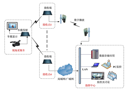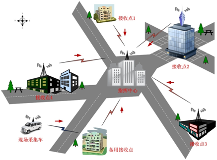 前端現(xiàn)場采集車安裝大功率車載設備在城市各區(qū)內(nèi)巡邏,實時將采集的音視頻信息傳給就近接收點,接收點用微波、光纖或專網(wǎng)等設施傳輸給指揮中心。