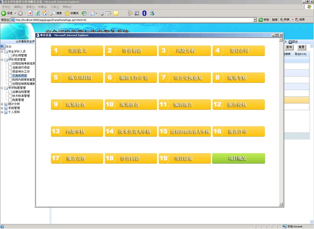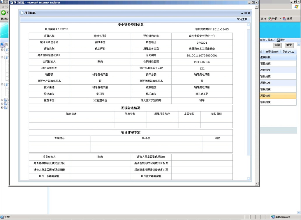 按照安評(píng)過程控制標(biāo)準(zhǔn),結(jié)合安全評(píng)價(jià)機(jī)構(gòu)的日常工作流程,對(duì)安全評(píng)價(jià)整個(gè)過程進(jìn)行網(wǎng)絡(luò)化地控制和監(jiān)管,根據(jù)風(fēng)險(xiǎn)分析、實(shí)施評(píng)價(jià)、報(bào)告審核、技術(shù)支撐、作業(yè)文件、內(nèi)部管理、檔案管理和檢查改進(jìn)八要素對(duì)所有評(píng)價(jià)項(xiàng)目過程進(jìn)行嚴(yán)格把關(guān),要求安全評(píng)價(jià)機(jī)構(gòu)將現(xiàn)有項(xiàng)目的進(jìn)度情況及時(shí)上報(bào)到系統(tǒng)中,規(guī)范安全評(píng)價(jià)機(jī)構(gòu)工作流程,實(shí)現(xiàn)安全評(píng)價(jià)過程控制的信息化,在方便安全評(píng)價(jià)機(jī)構(gòu)內(nèi)部管理的同時(shí)有利于監(jiān)管部門對(duì)安全評(píng)價(jià)機(jī)構(gòu)的評(píng)價(jià)行為進(jìn)行實(shí)時(shí)動(dòng)態(tài)的監(jiān)督管理。