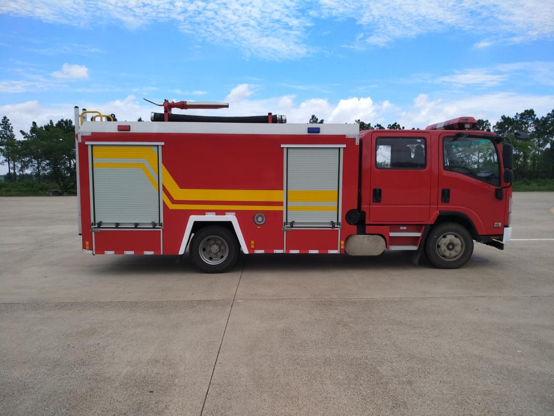 CLW5100GXFSG35/QL型水罐消防車(chē),采用重慶五十鈴700P,型號(hào)QL1110ANKAY二類(lèi)底盤(pán)改裝而成。整車(chē)由消防員乘員室和車(chē)身兩大部分組成,乘員室為雙排駕駛室,可乘坐 3+3 人,該車(chē)為外露罐結(jié)構(gòu),車(chē)身前部為器材箱,中部為水罐,后部為泵房。載液罐體為優(yōu)質(zhì)碳鋼,內(nèi)部噴涂環(huán)氧底漆及環(huán)氧瀝青漆,與底盤(pán)采用彈性連接,載水量3550kg,裝備了CB20.10/15.30中低壓消防泵,額定流量15/30 L/S,車(chē)頂安裝PS30-50D型消防炮。該車(chē)最大的特點(diǎn)是載液量大、操控性好、維修簡(jiǎn)便??蓮V泛應(yīng)用于公安消防隊(duì)、廠(chǎng)礦企業(yè)及社區(qū)、碼頭等場(chǎng)所,撲救大型油類(lèi)火災(zāi)和一般物質(zhì)火災(zāi)。