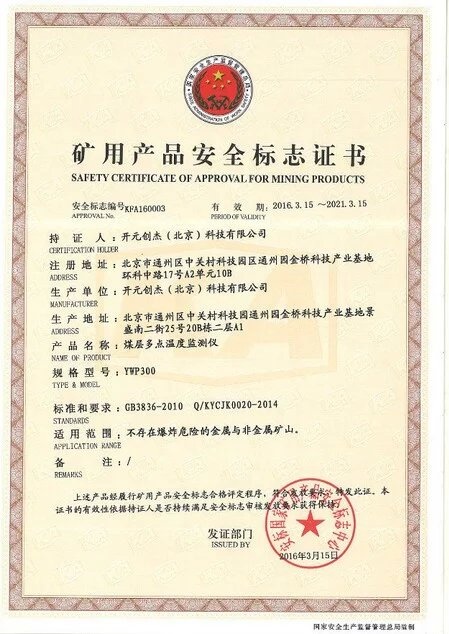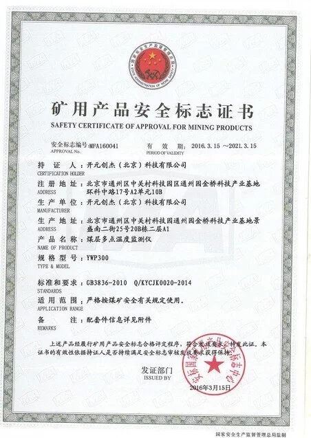 YWP300煤層多點溫度檢測儀取得安標(biāo)認證