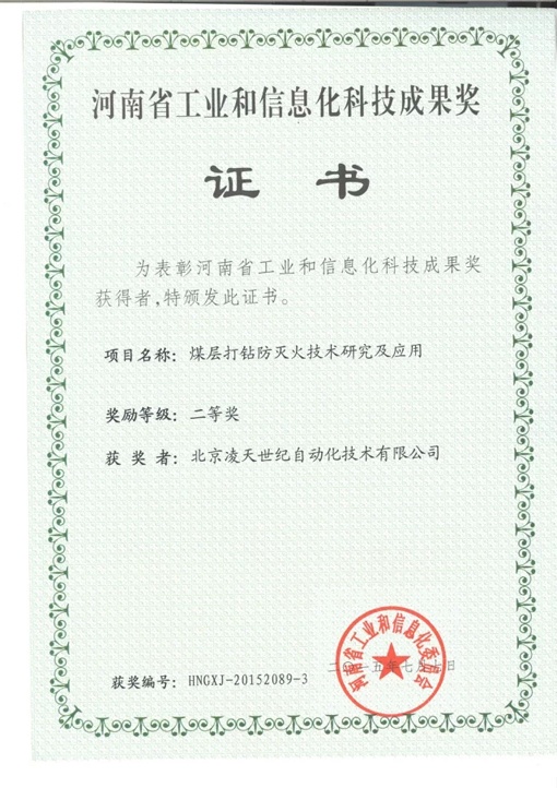 北京凌天煤層打鉆防滅火系統(tǒng)獲河南省工業(yè)和信息化二等獎