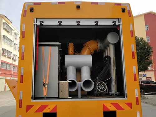 配備一臺一體式真空輔助自吸排污泵,流量1500m3/h,電機(jī)功率90kw,揚(yáng)程14m,吸程8m,安裝在車輛尾部,方便拆卸水管及出水。該泵無需灌水,無需額外增加水環(huán)泵輔助抽真空,性能好,出水快。水泵啟動采用軟啟動