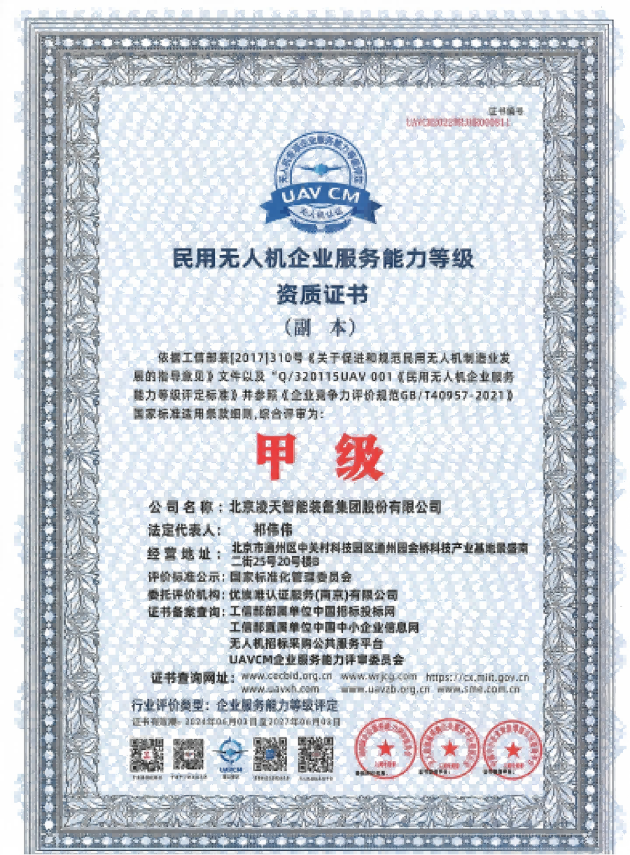 資格類民用無(wú)人機(jī)企業(yè)服務(wù)能力等級(jí)資質(zhì)證書(shū)(甲級(jí))