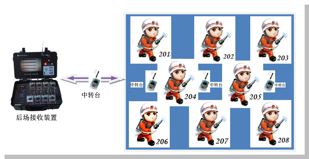 指揮員可根據(jù)監(jiān)視的情況,發(fā)出單呼巡查,群呼巡查,單呼撤退,群呼撤退的指令。呼救器佩戴人員可實(shí)時(shí)接收指令,通過(guò)聲響提示查看巡查和撤退的狀態(tài),實(shí)時(shí) 互動(dòng)回應(yīng),為指揮員直觀判斷現(xiàn)場(chǎng)的情況,提供非常可靠的指揮依據(jù)。該設(shè)備配套的呼救器具有遠(yuǎn)距離數(shù)據(jù)通信功能,具有群組獨(dú)立使用的功能。其中一個(gè)呼救器報(bào)警,群組呼救器都能有聲響提示,顯示報(bào)警的編組編號(hào),兼有現(xiàn)場(chǎng)指揮員主呼撤退的功能。每套產(chǎn)品編組顯示:1-4組,每組編號(hào)顯示:1-8人 ,每套最大使用數(shù)量32人,可編不同ID套數(shù):40套,可編不同組號(hào):160組,可編不同ID號(hào):1280個(gè)編號(hào) 。